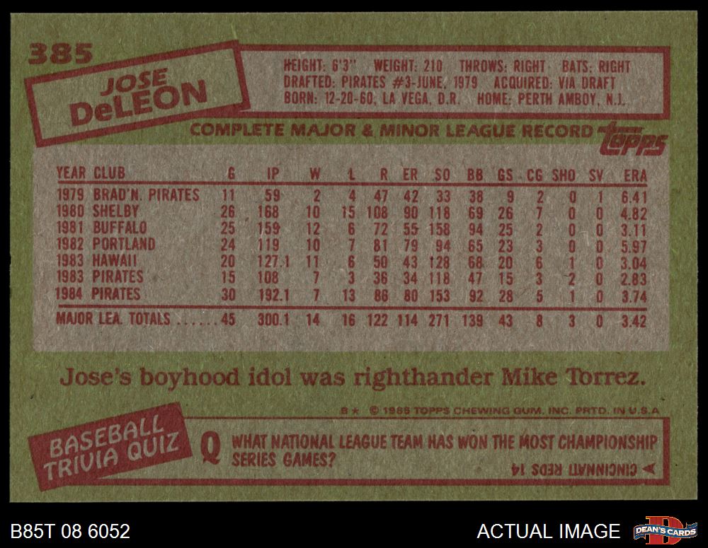 1985 Topps #385 Jose DeLeon 8.5 - NM/MT+
