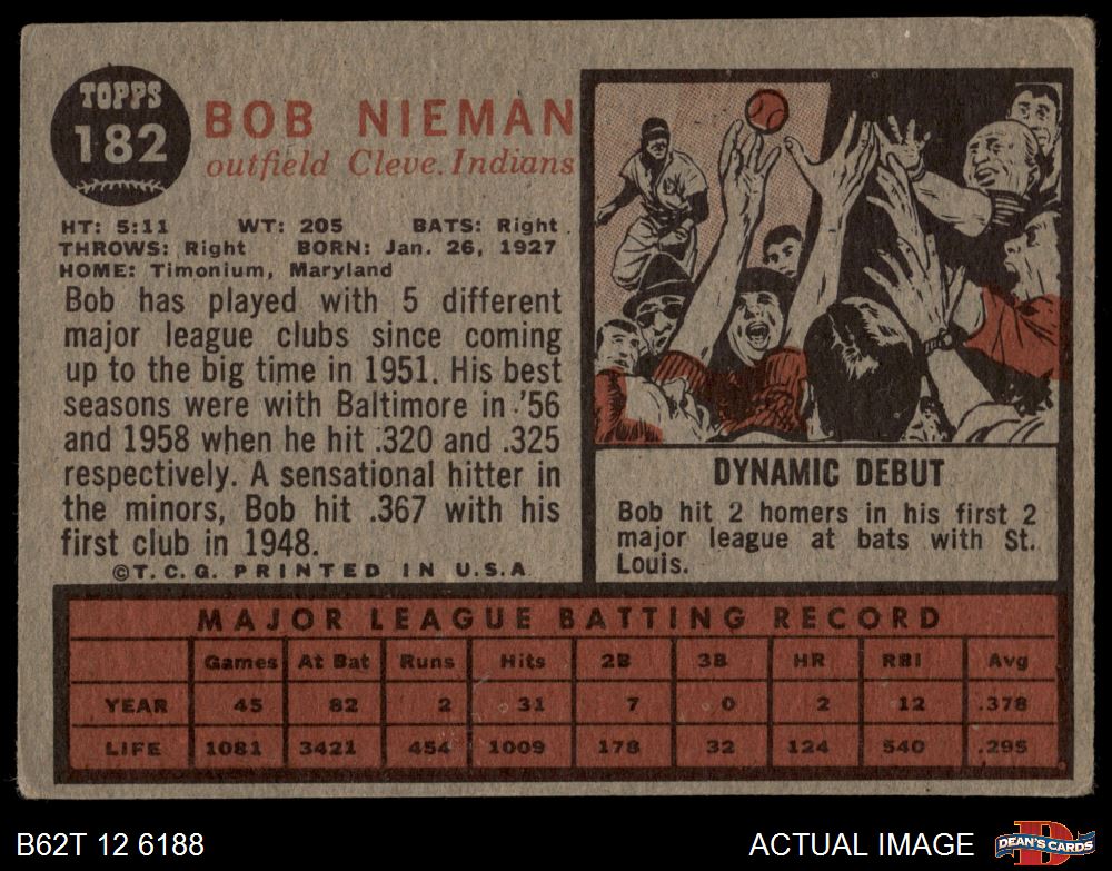 1962 Topps #182 NRM Bob Nieman 1 - POOR