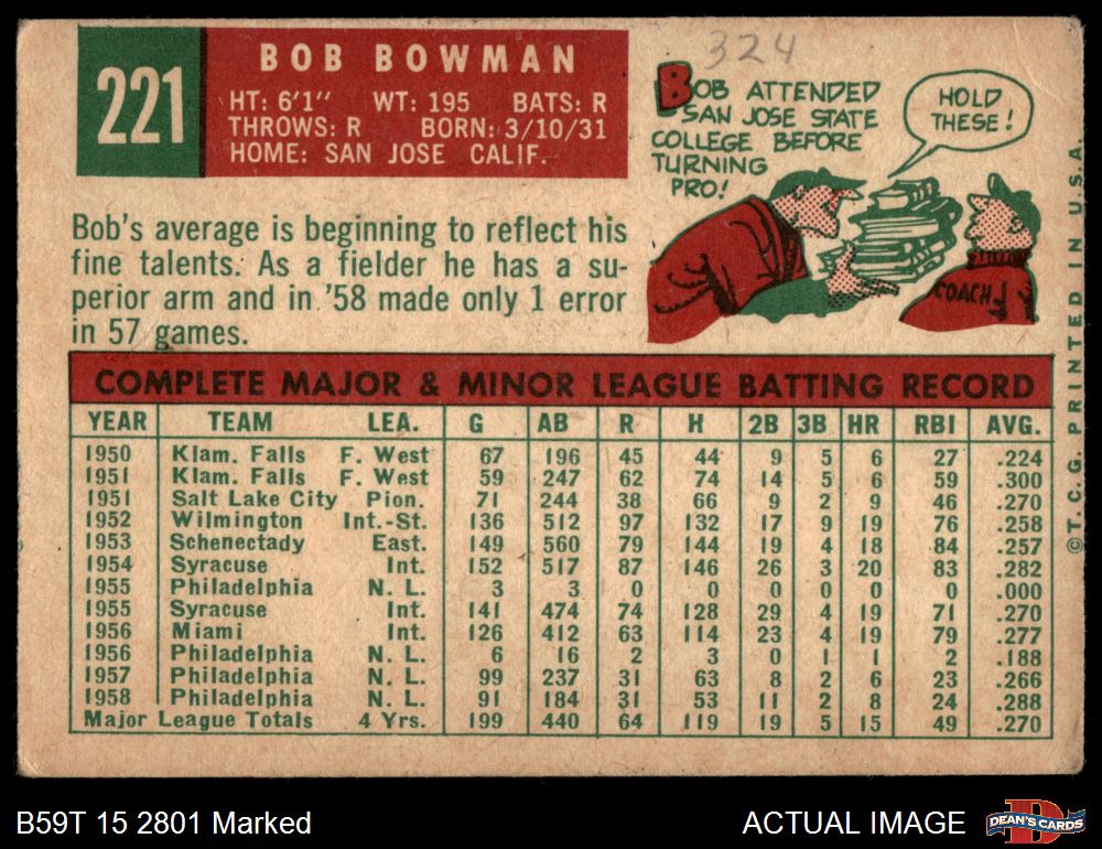 1959 Topps #221 Bob Bowman 1.5 - FAIR