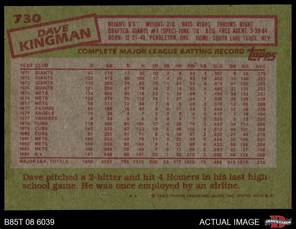 1985 Topps #730 Dave Kingman