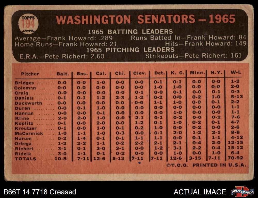 1966 Topps Baseball Cards (15,474 available)1966 Topps Senators (1,162 available)