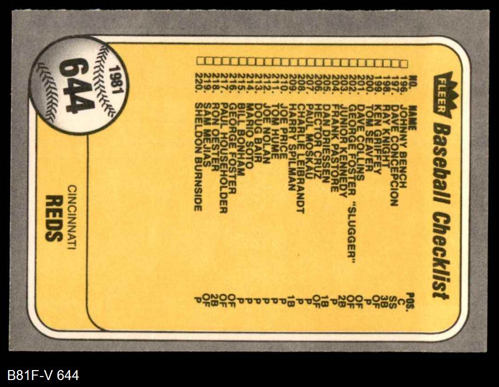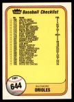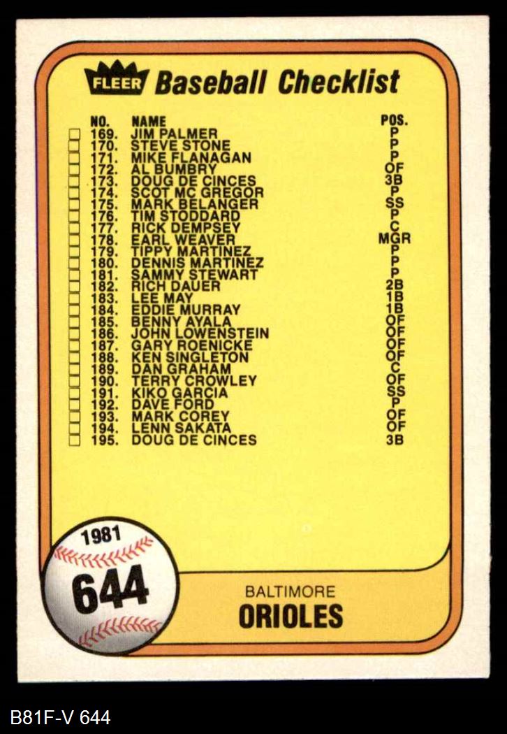 1981 Fleer #644 COR Reds / Orioles Checklist