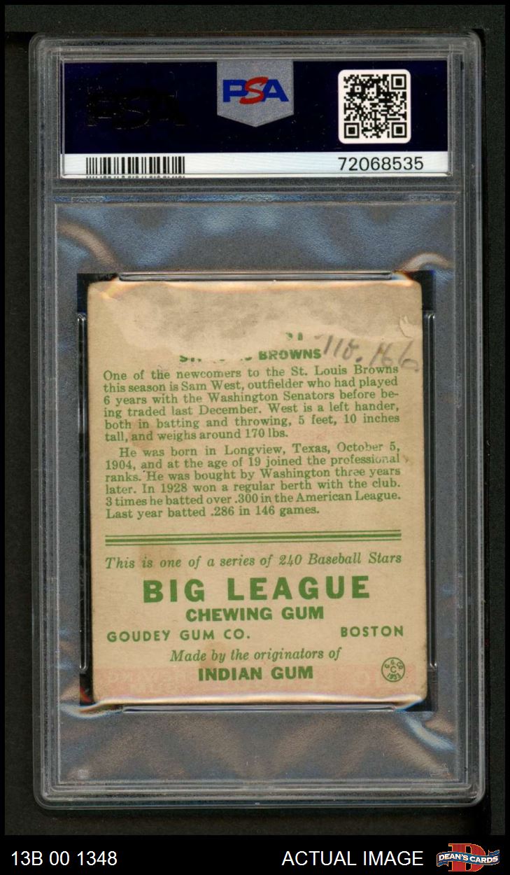 1933 Goudey #166 Sam West PSA AUTHENTIC