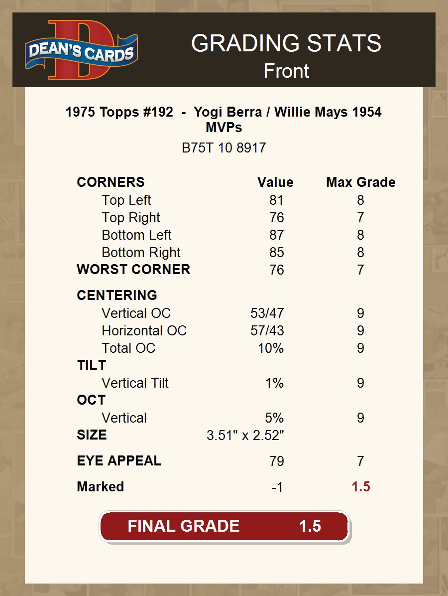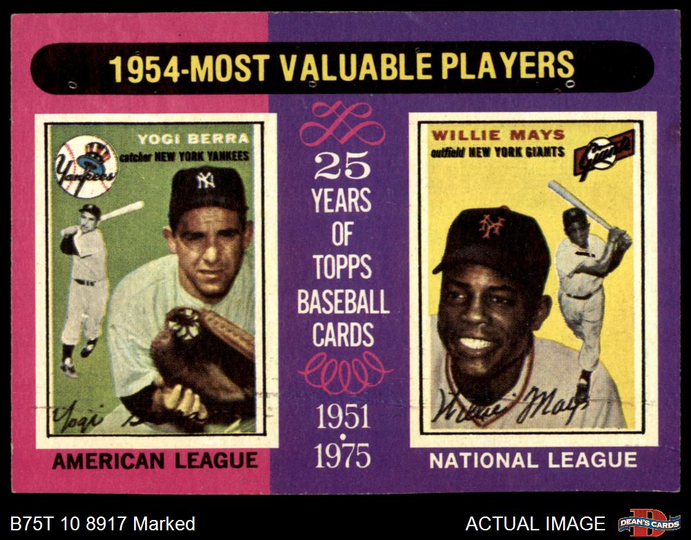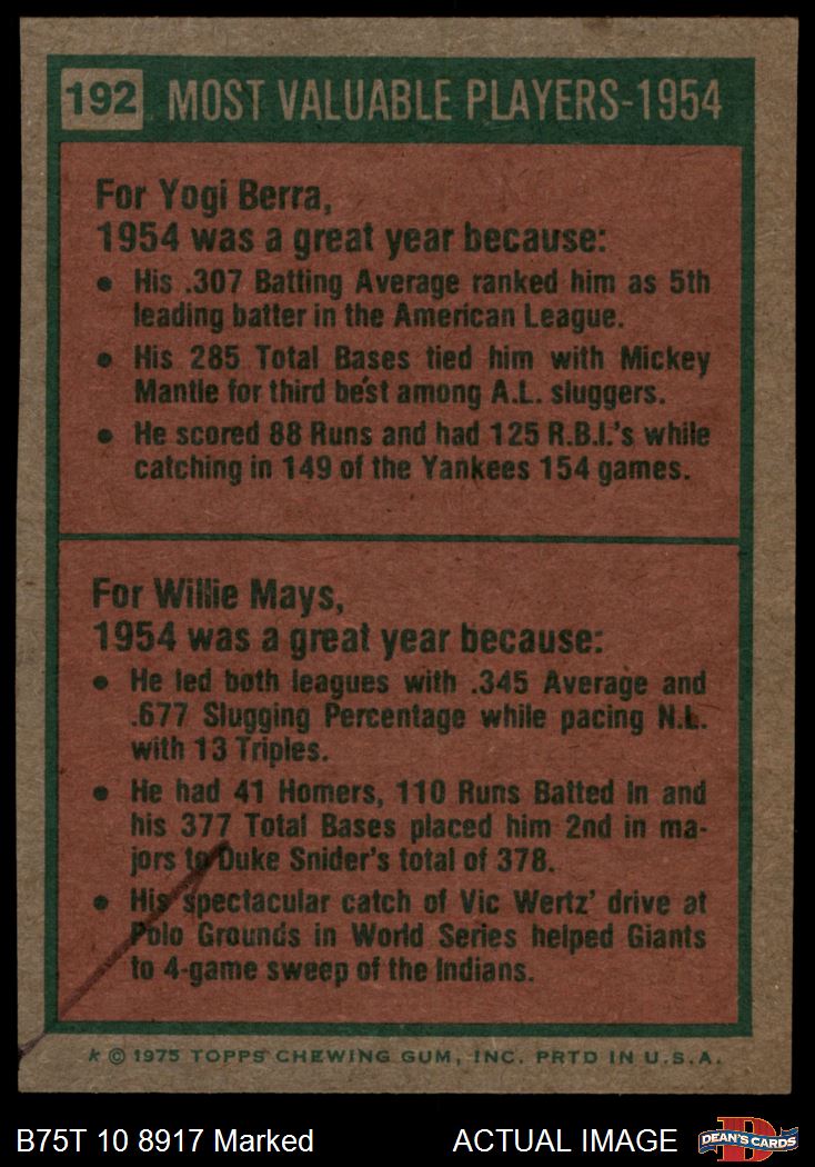 1975 Topps #192 - Yogi Berra / Willie Mays 1954 MVPs 1.5 - FAIR