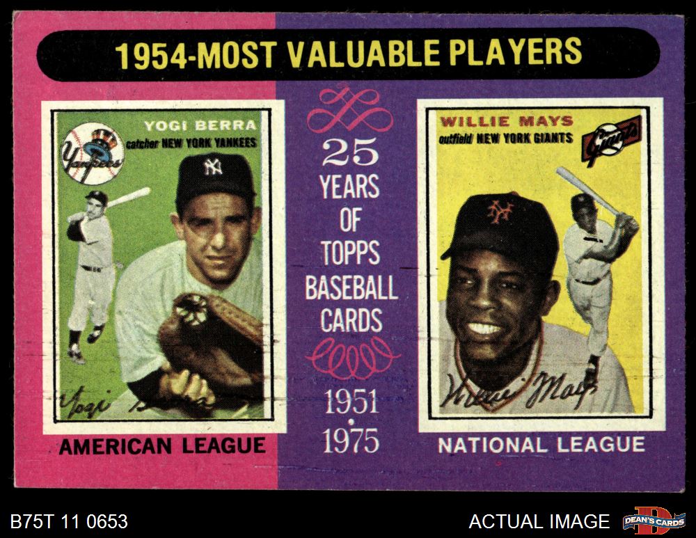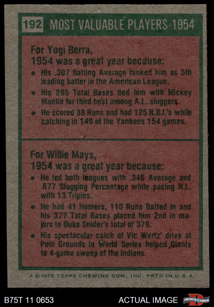 1975 Topps #192 - Yogi Berra / Willie Mays 1954 MVPs 4 - VG/EX