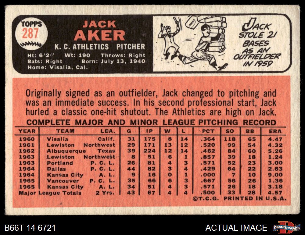 1966 Topps #287 Jack Aker 2.5 - GD+