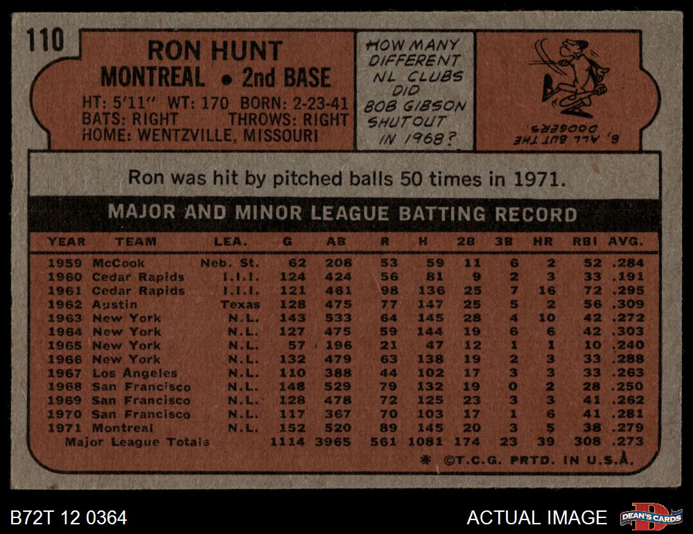 1972 Topps #110 Ron Hunt 2.5 - GD+