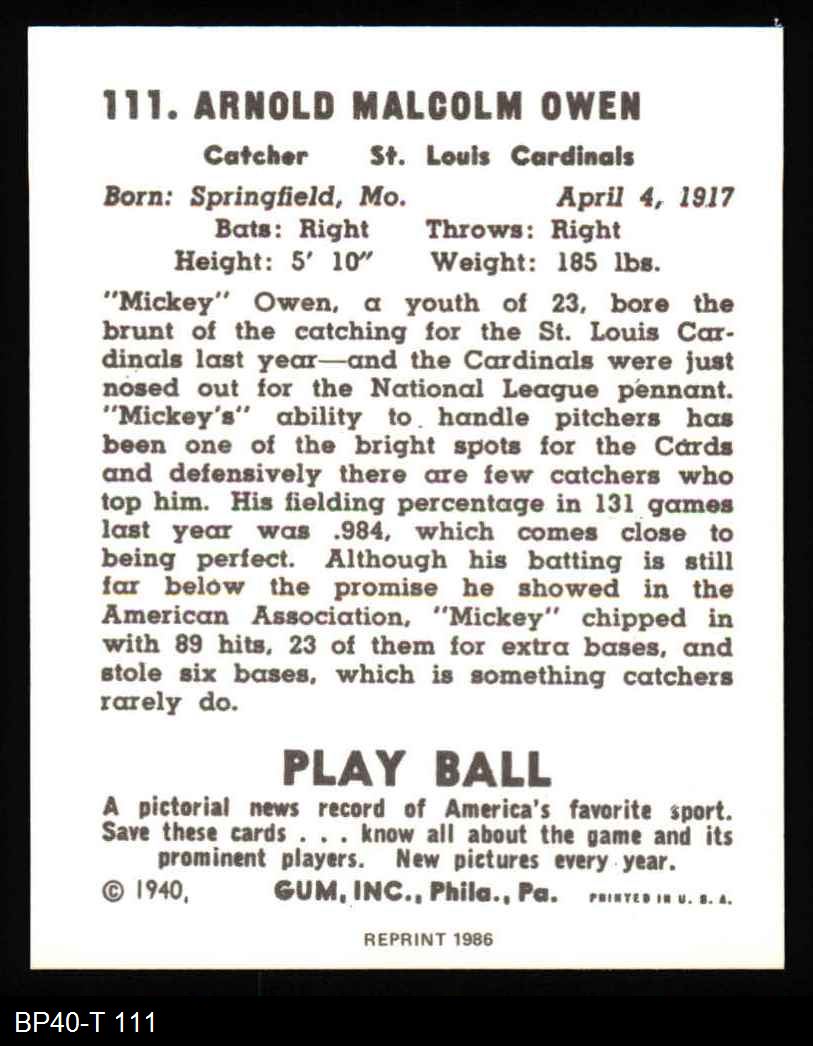 1940 Play Ball Reprint #111 Mickey Owen 8 - NM/MT