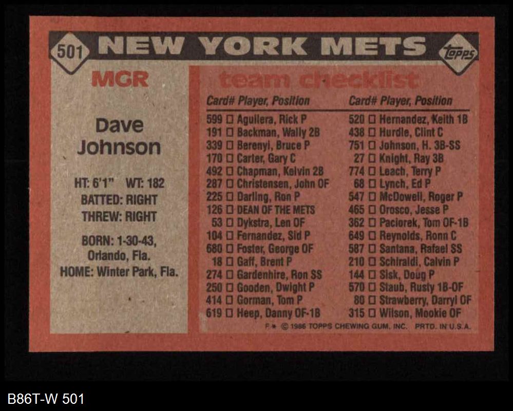 1986 Topps #501 Mets Team Checklist
