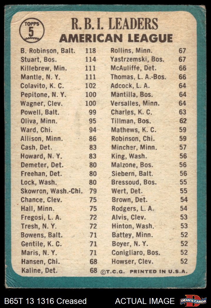1965 Topps #5 - Harmon Killebrew / Mickey Mantle / Brooks Robinson / Dick Stuart AL RBI Leaders 2 - GOOD