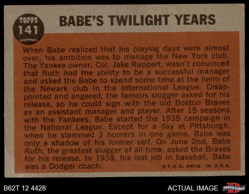 1962 Topps #141 NRM - Babe Ruth Twilight Years 2 - GOOD