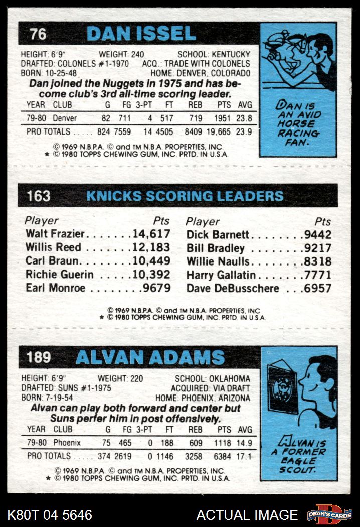 1980 Topps - Alvan Adams / Bill Cartwright / Dan Issel 189 / 163 / 76 6.5 - EX/MT+