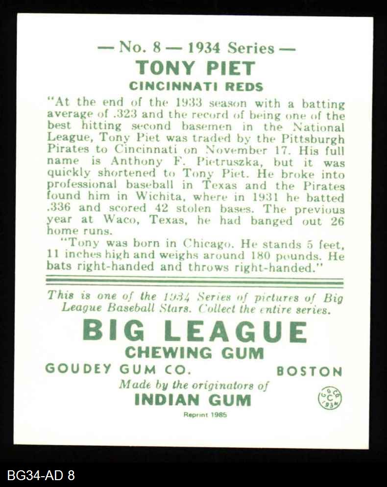 1934 Goudey Reprint #8 Tony Piet