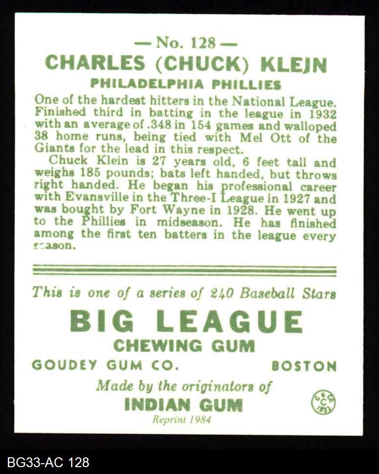 1933 Goudey Reprint #128 Chuck Klein 8 - NM/MT