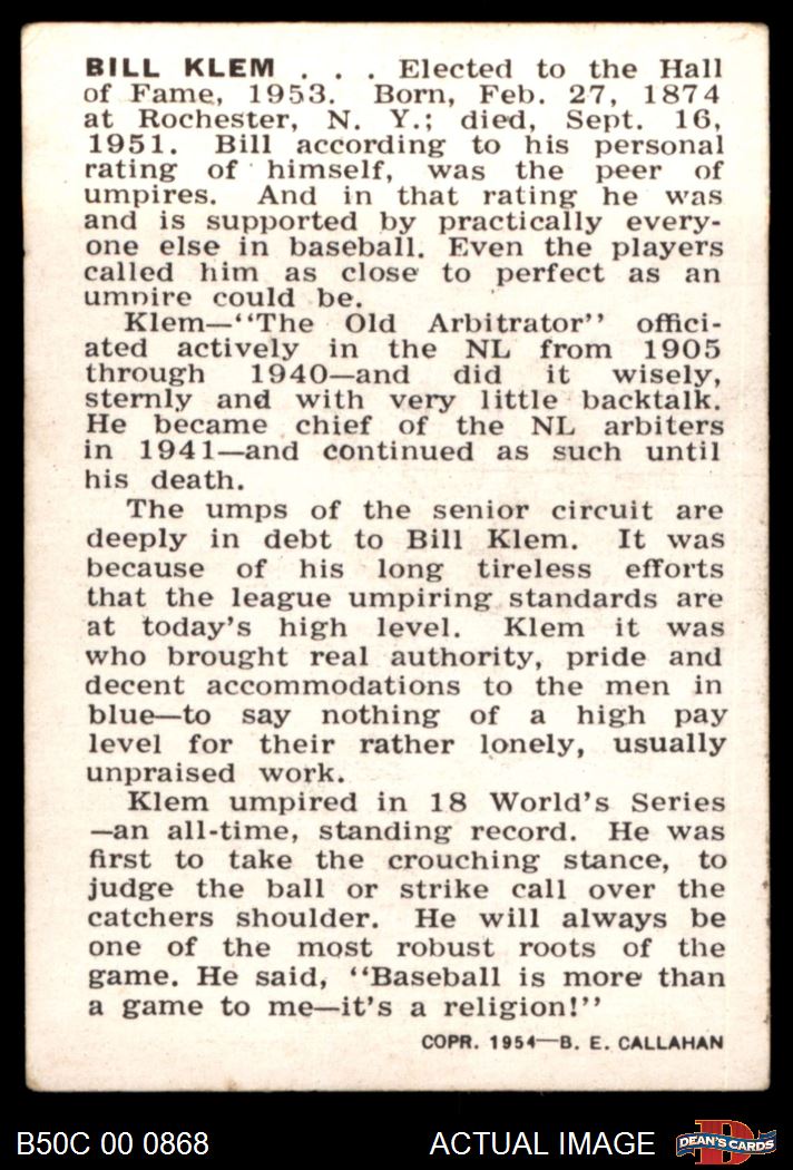 1950 Callahan Hall of Fame Issued in 1954 Bill Klem 4 - VG/EX