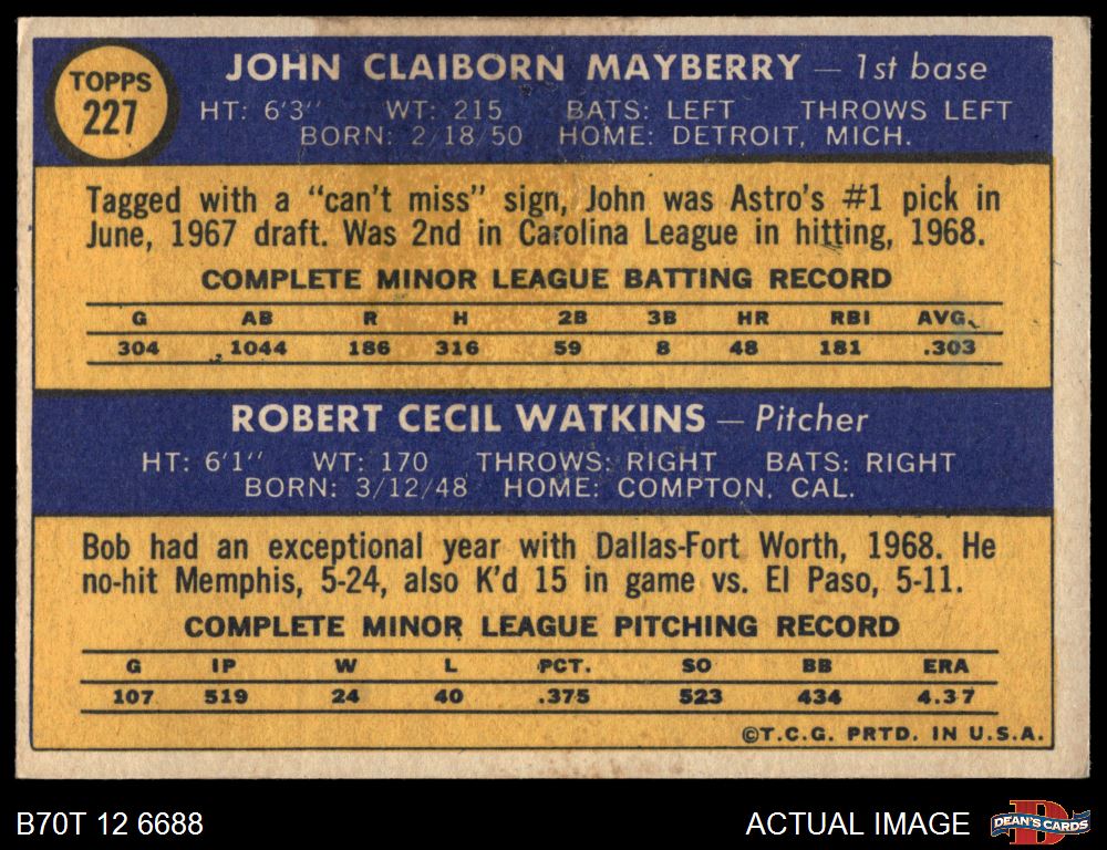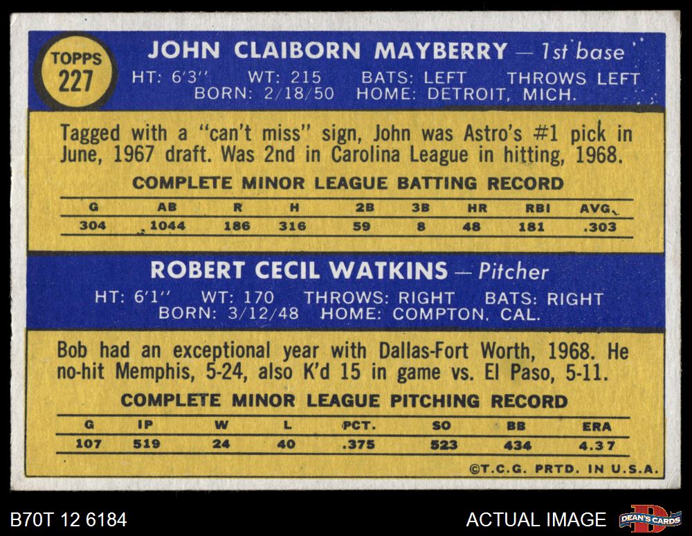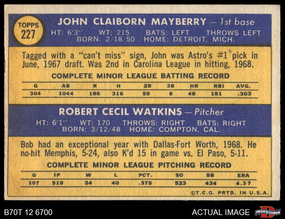 1970 Topps #227 - John Mayberry / Bob Watkins Astros Rookies 4 - VG/EX