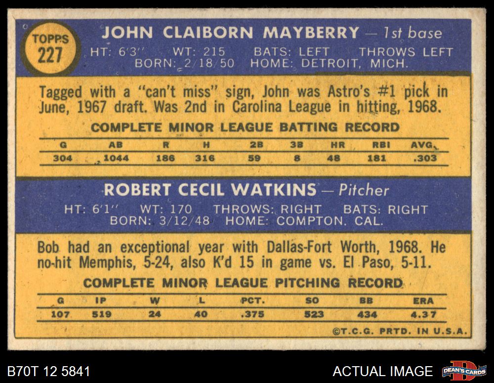 1970 Topps #227 - John Mayberry / Bob Watkins Astros Rookies 5 - EX