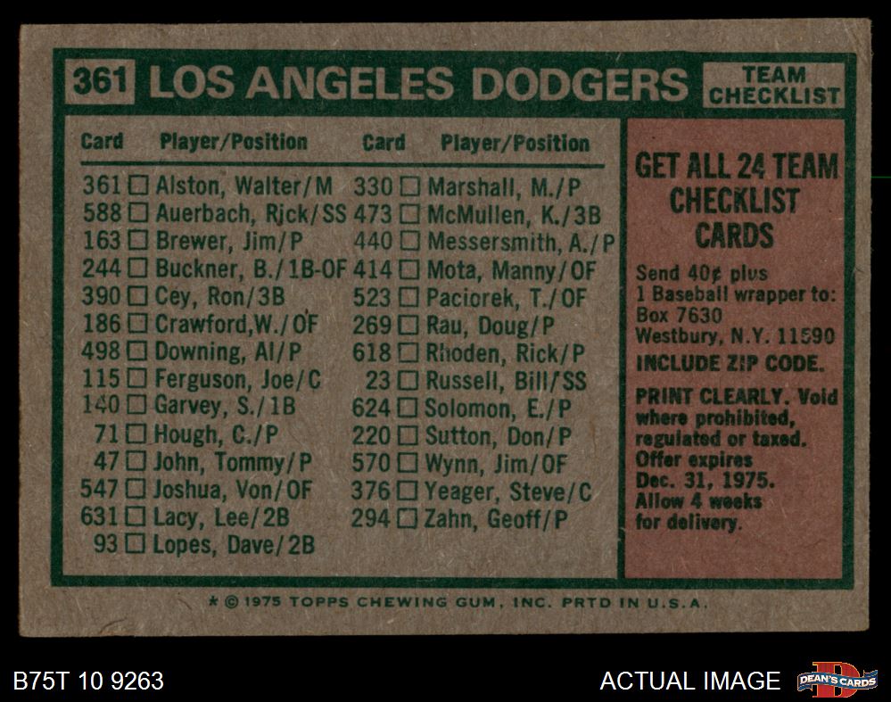 1975 Topps #361 - Walter Alston Dodgers Team Checklist 1.5 - FAIR
