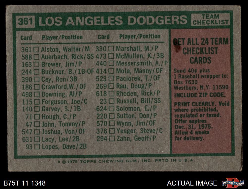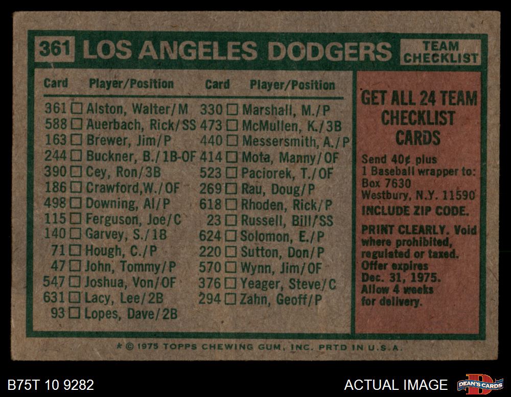 1975 Topps #361 - Walter Alston Dodgers Team Checklist 2 - GOOD