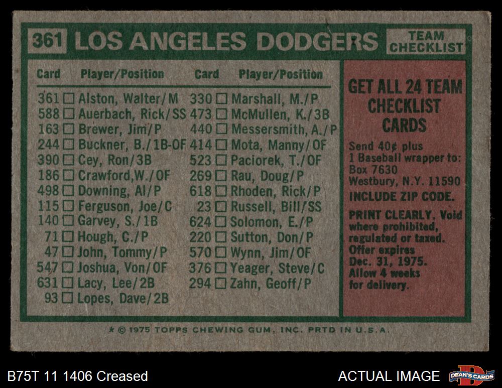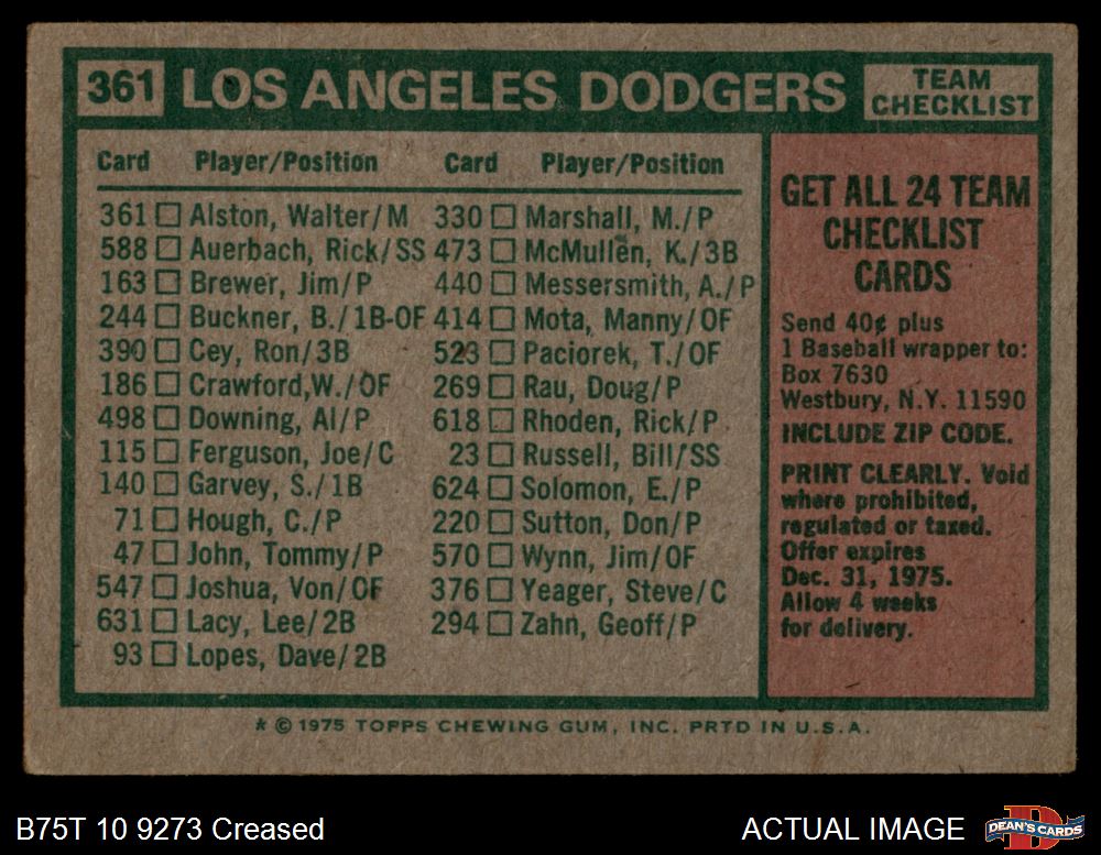1975 Topps #361 - Walter Alston Dodgers Team Checklist 3 - VG
