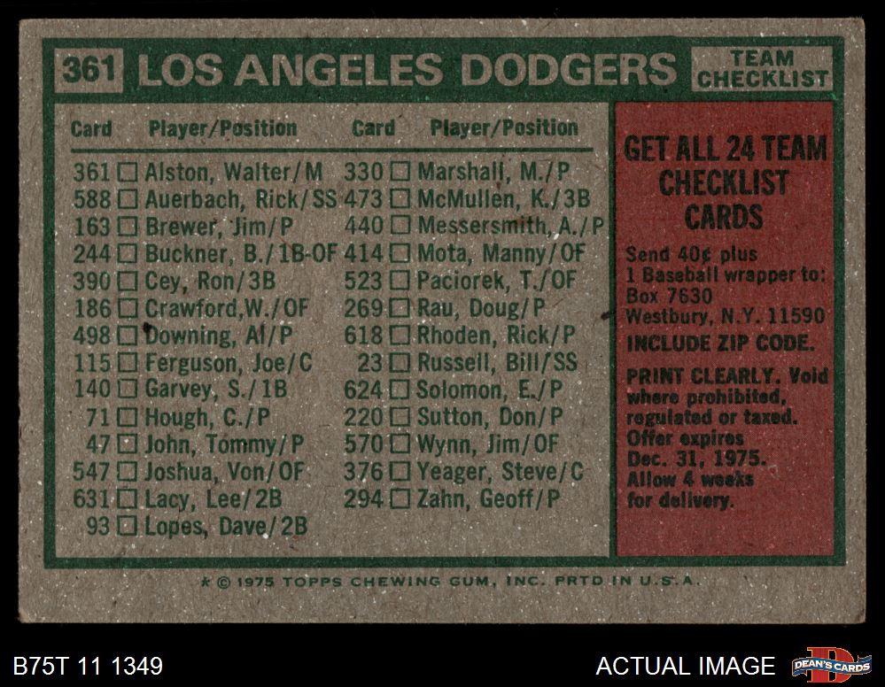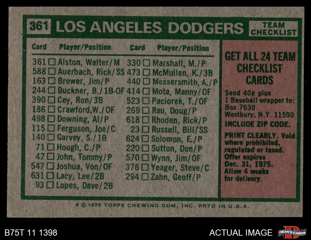 1975 Topps #361 - Walter Alston Dodgers Team Checklist 4 - VG/EX