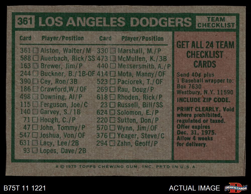 1975 Topps #361 - Walter Alston Dodgers Team Checklist 7 - NM