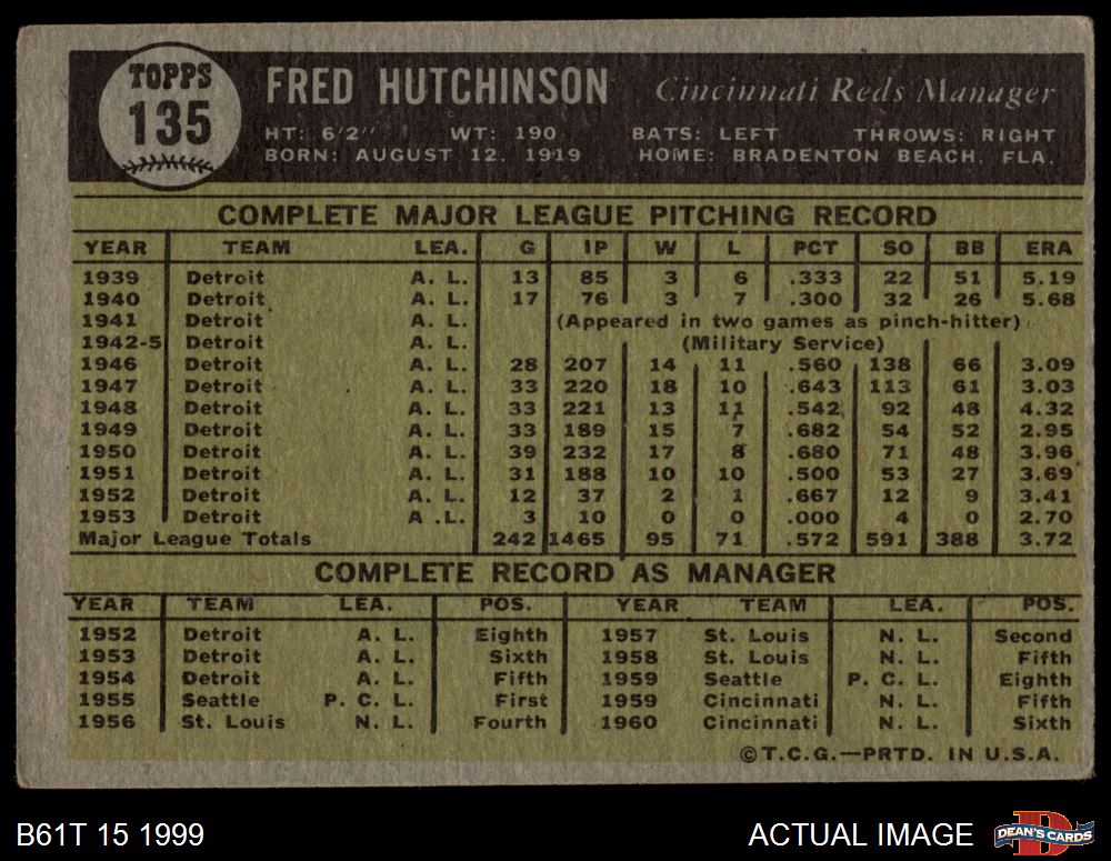 1961 Topps #135 Fred Hutchinson 3 - VG