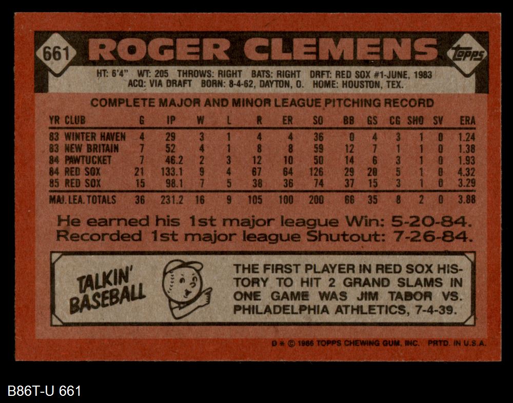 1986 Topps #661 Roger Clemens
