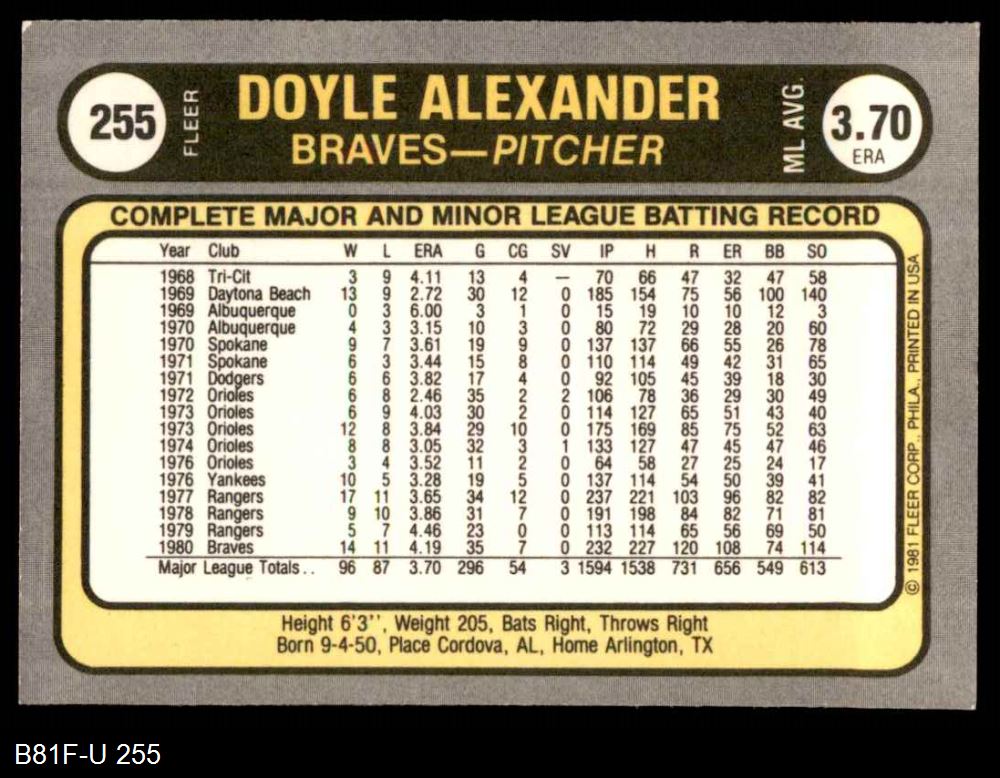 1981 Fleer #255 Doyle Alexander 8 - NM/MT