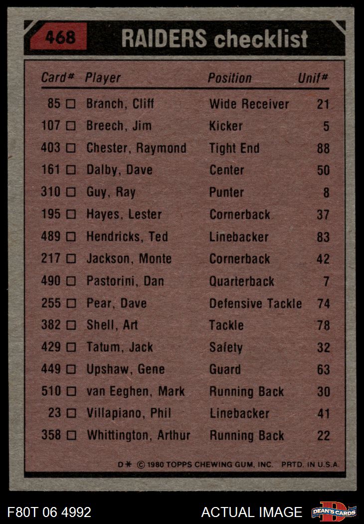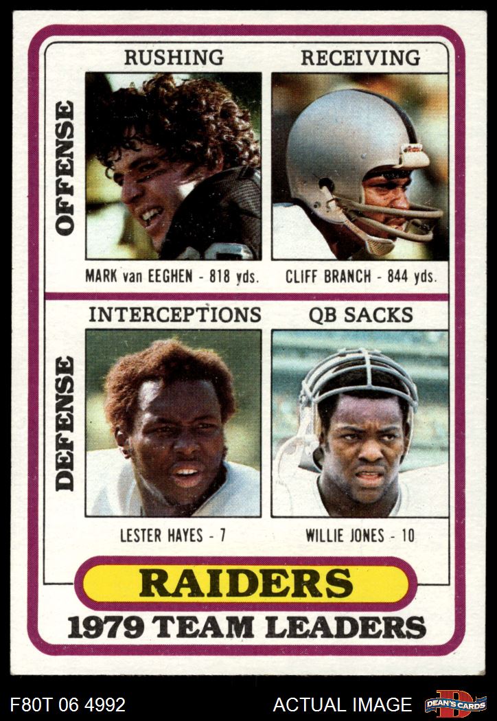 1980 Topps #468 - Mark van Eeghen / Cliff Branch / Lester Hayes / Willie Jones Raiders Leaders & Checklist 4 - VG/EX