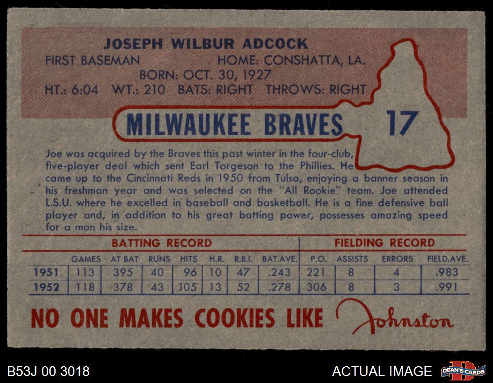 1953 Johnston Cookies #17 Joe Adcock 3 - VG