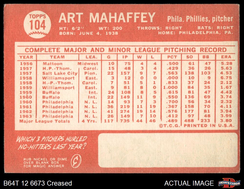 1964 Topps #104 Art Mahaffey 2 - GOOD