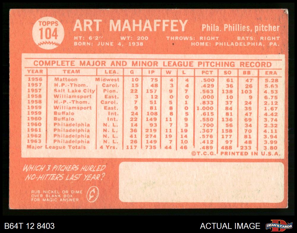 1964 Topps #104 Art Mahaffey 4 - VG/EX