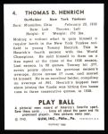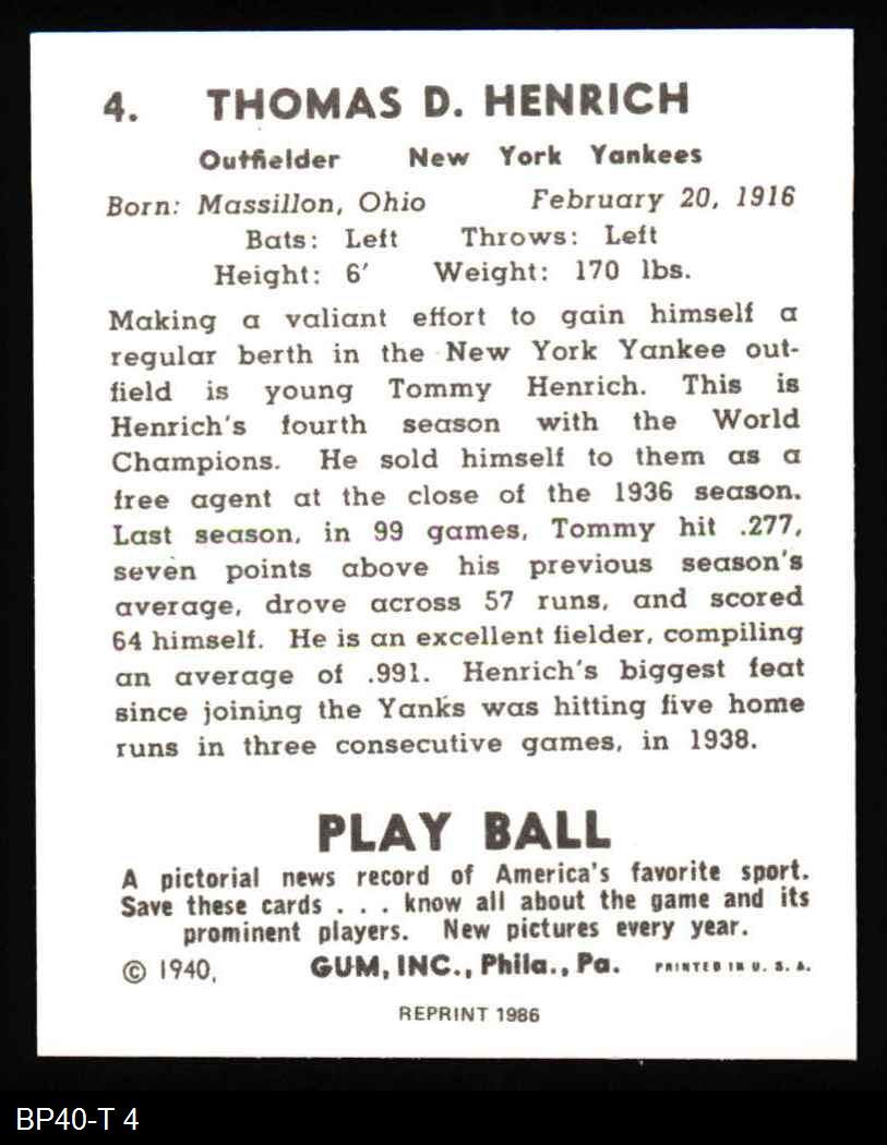 1940 Play Ball Reprint #4 Tommy Henrich 8 - NM/MT