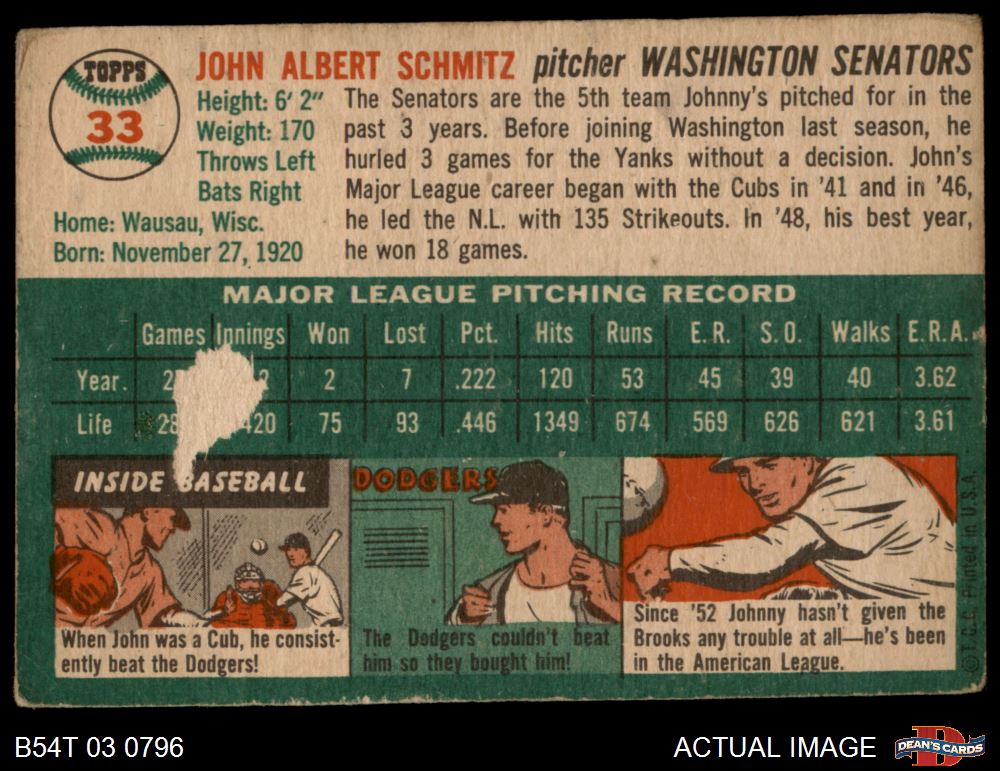 1954 Topps #33 WHT Johnny Schmitz 1 - POOR