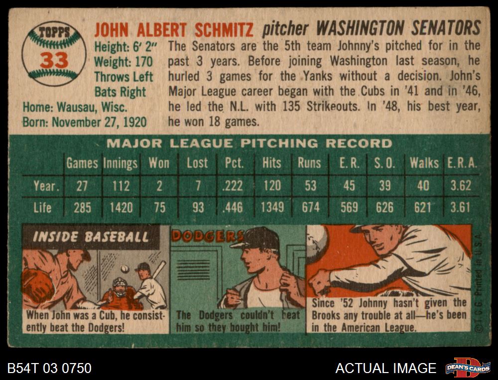 1954 Topps #33 WHT Johnny Schmitz 3 - VG