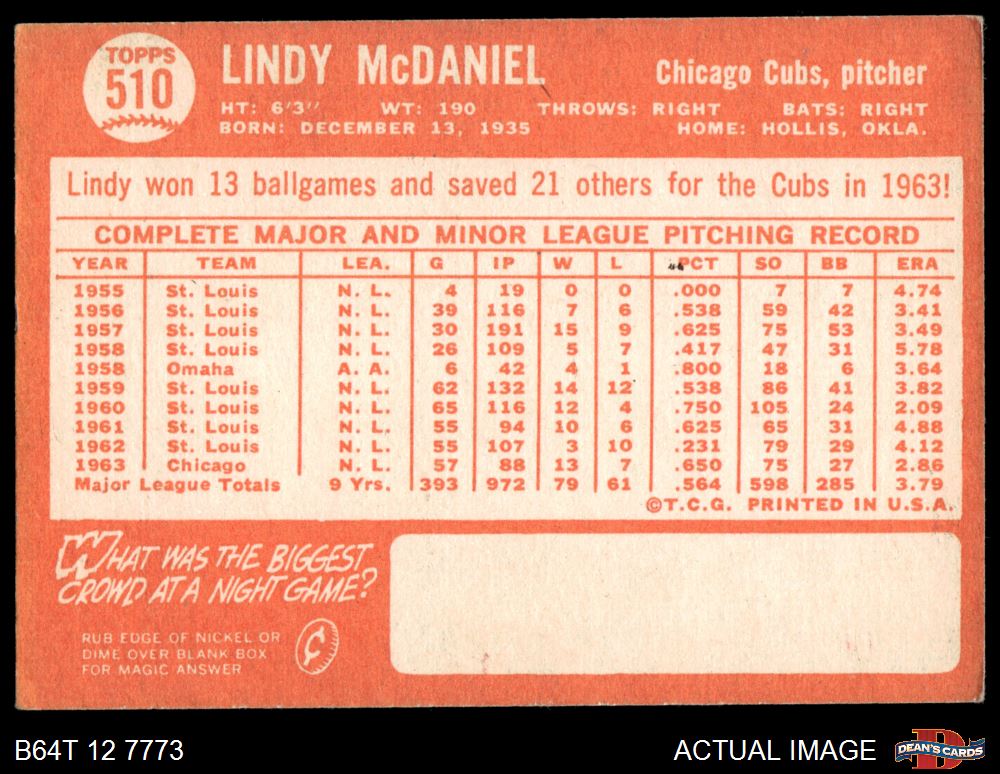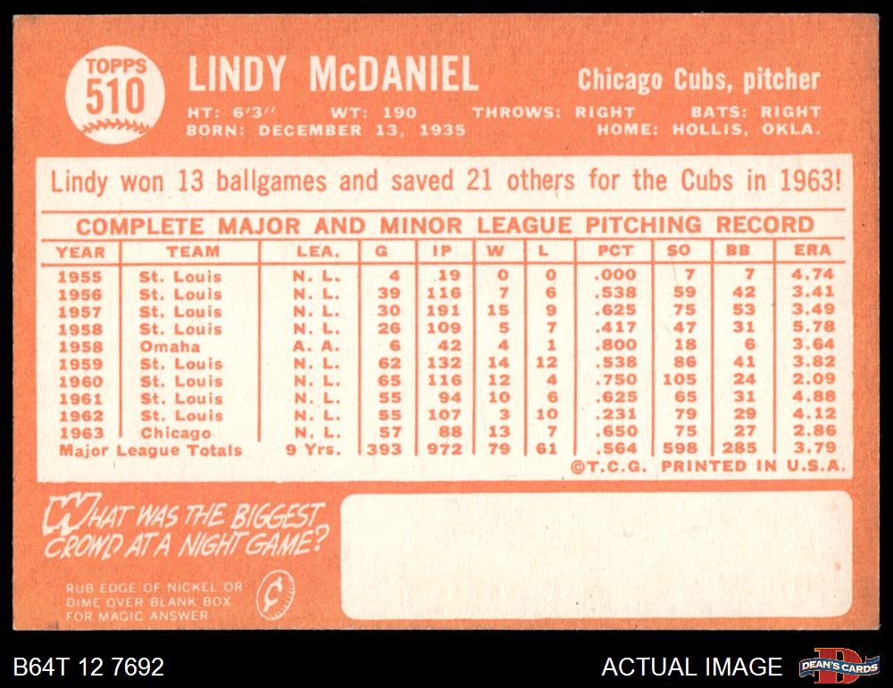 1964 Topps #510 Lindy McDaniel