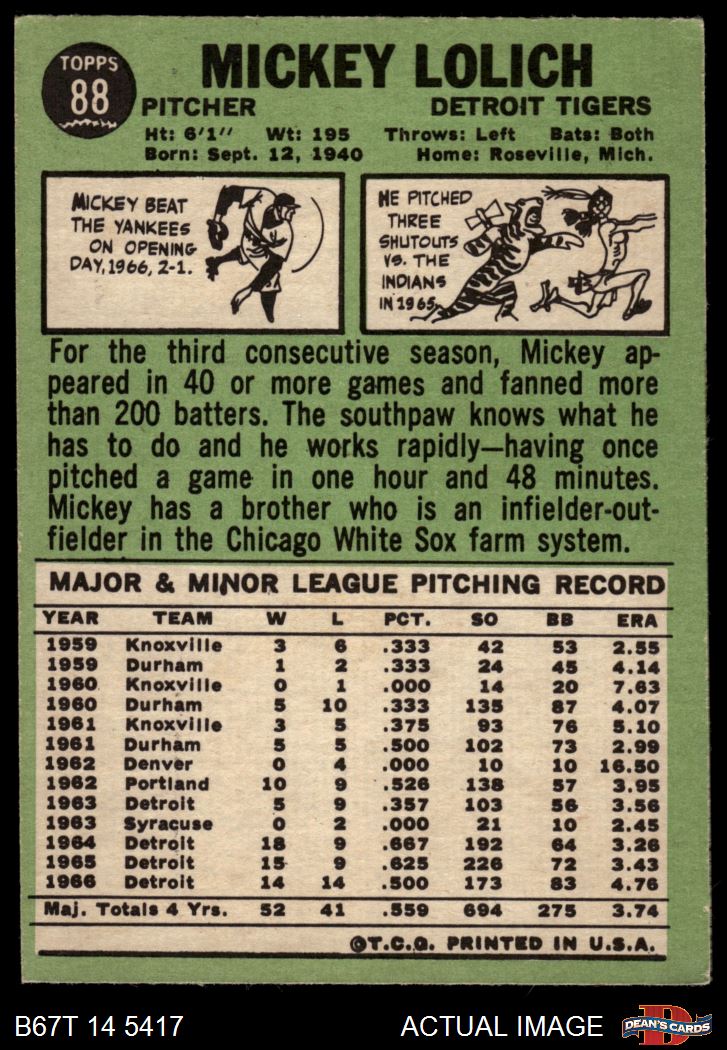 1967 Topps #88 Mickey Lolich 3 - VG