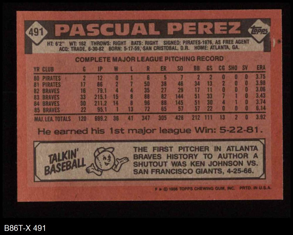 1986 Topps #491 Pascual Perez 8 - NM/MT