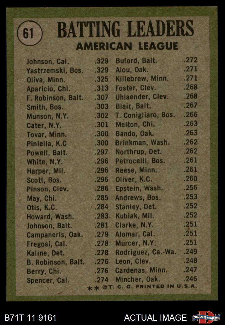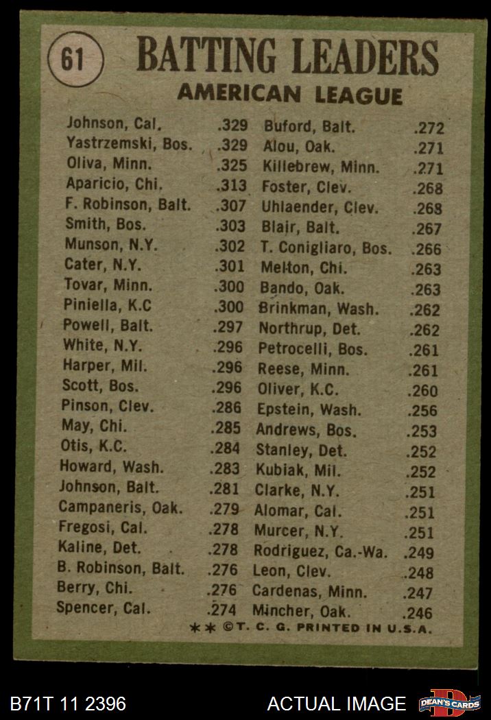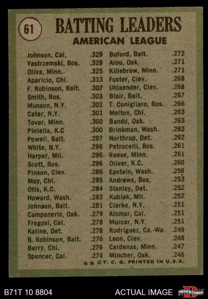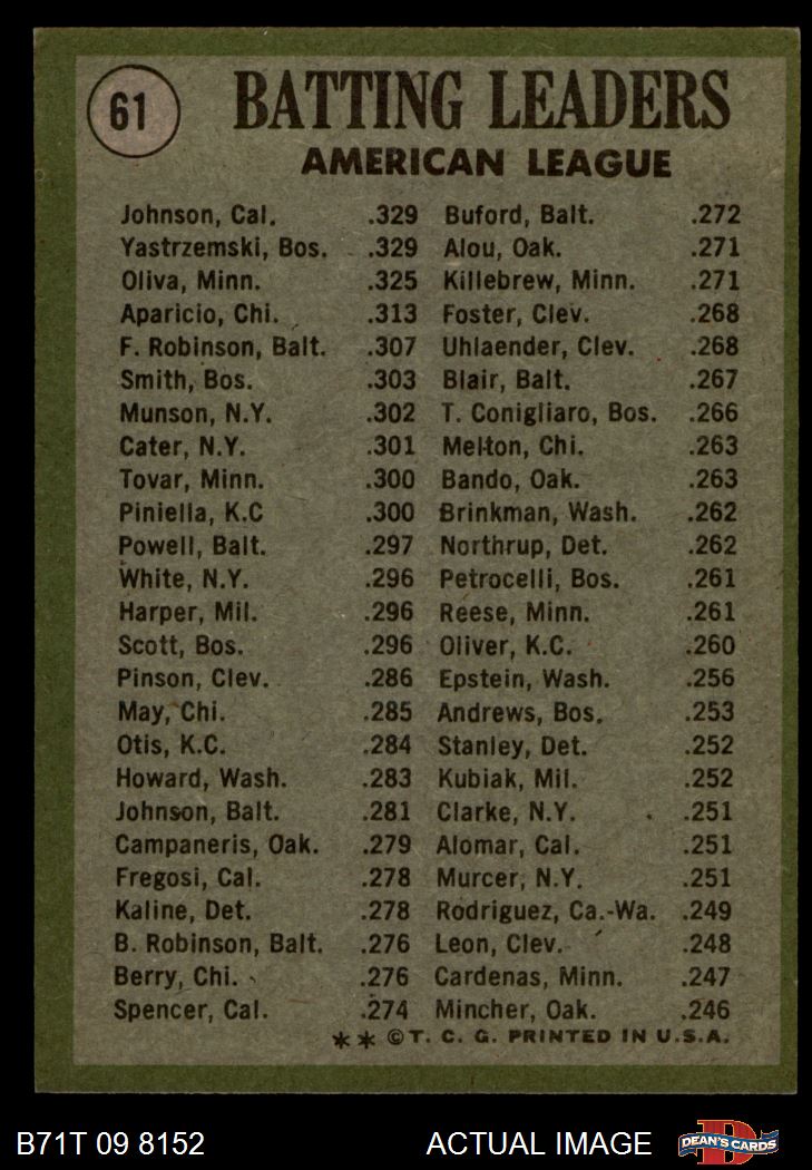 1971 Topps #61 - Alex Johnson / Tony Oliva / Carl Yastrzemski AL Batting Leaders 5 - EX