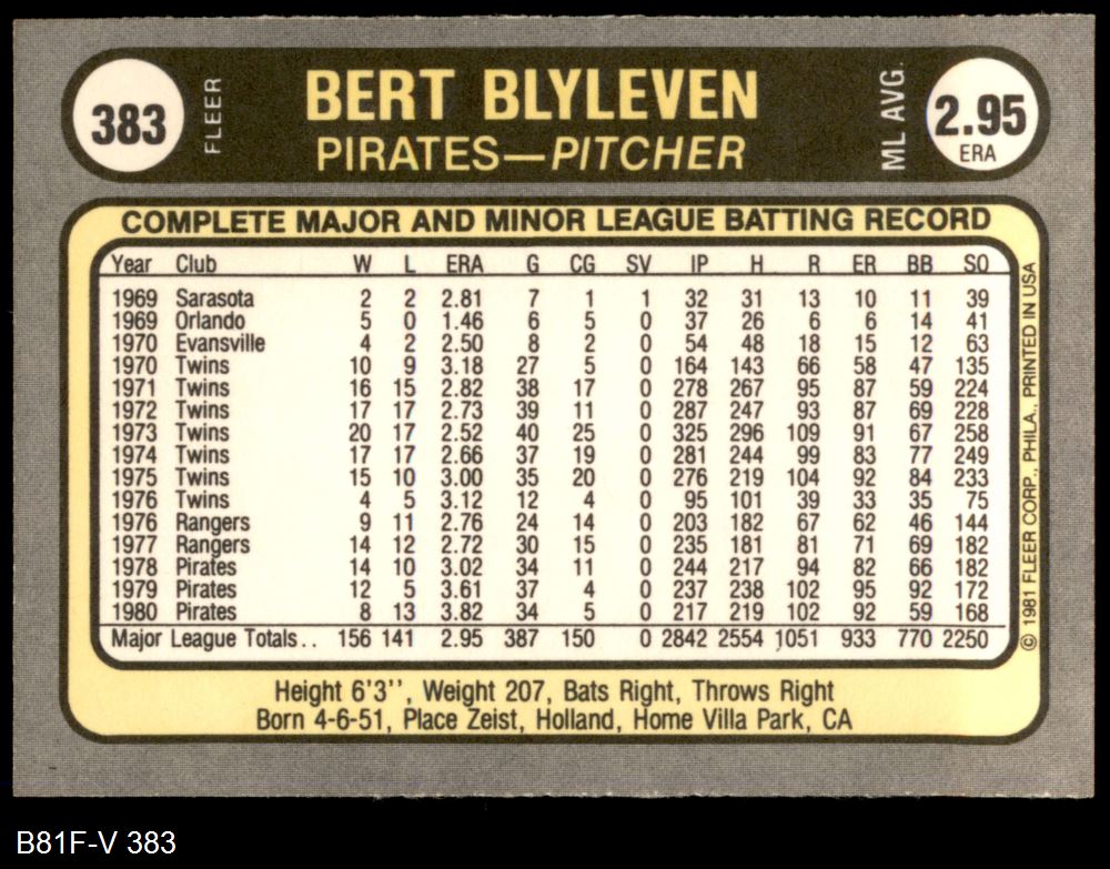 1981 Fleer #383 Bert Blyleven 8 - NM/MT