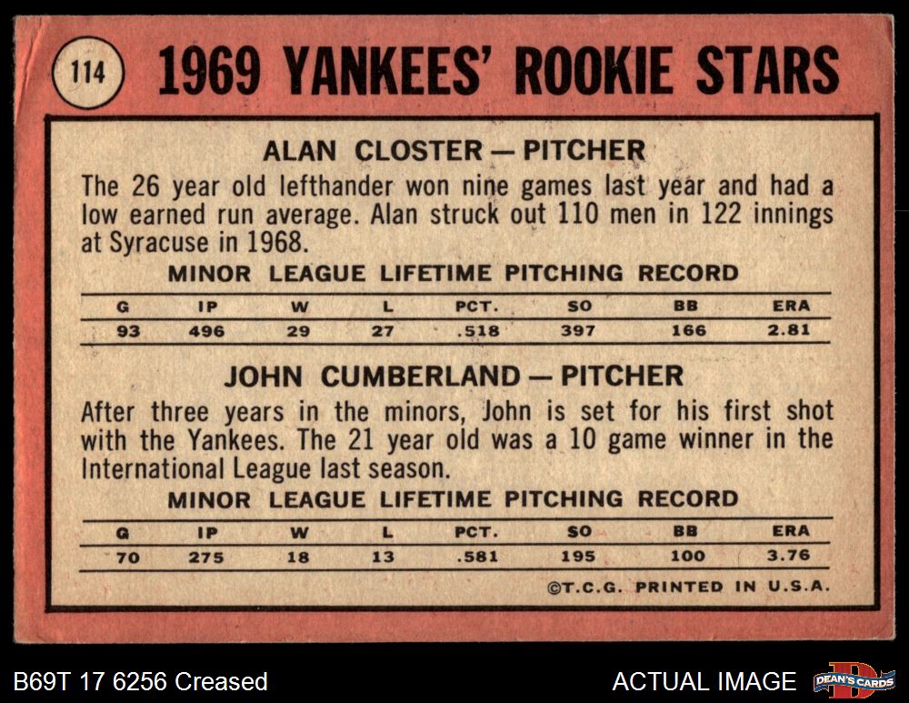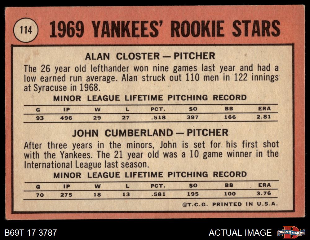 1969 Topps #114 - Alan Closter / John Cumberland Yankees Rookies 3 - VG