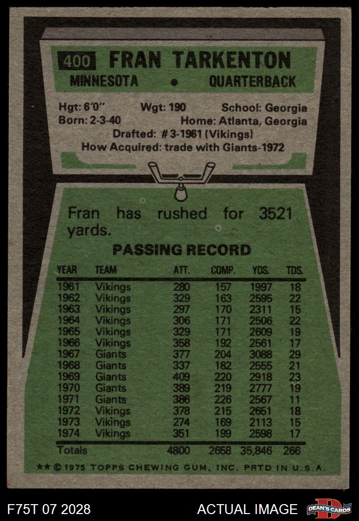 1975 Topps #400 Fran Tarkenton 4 - VG/EX