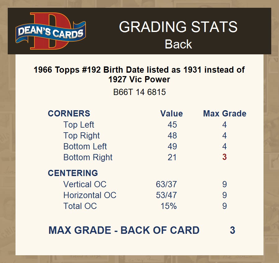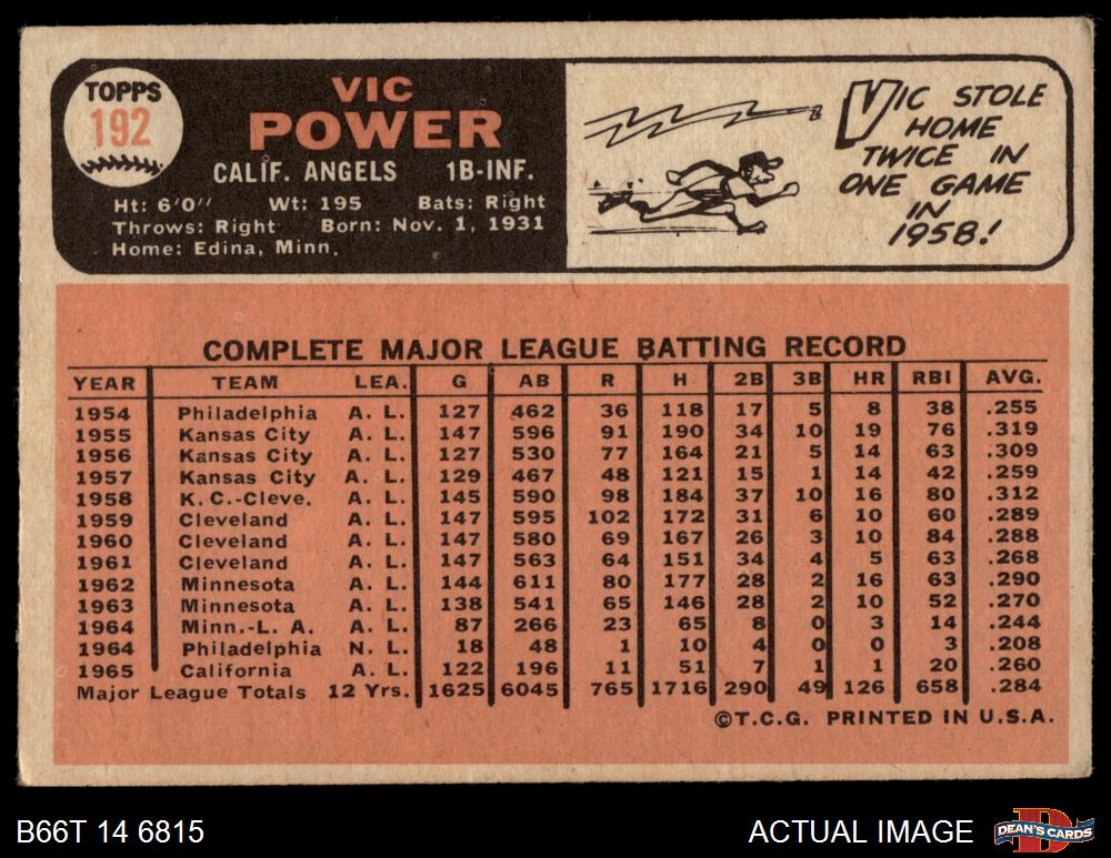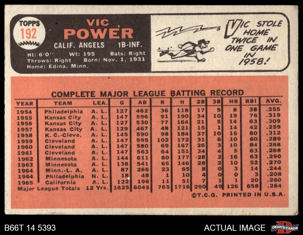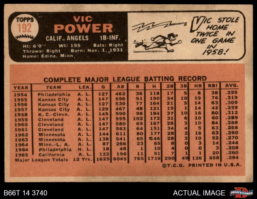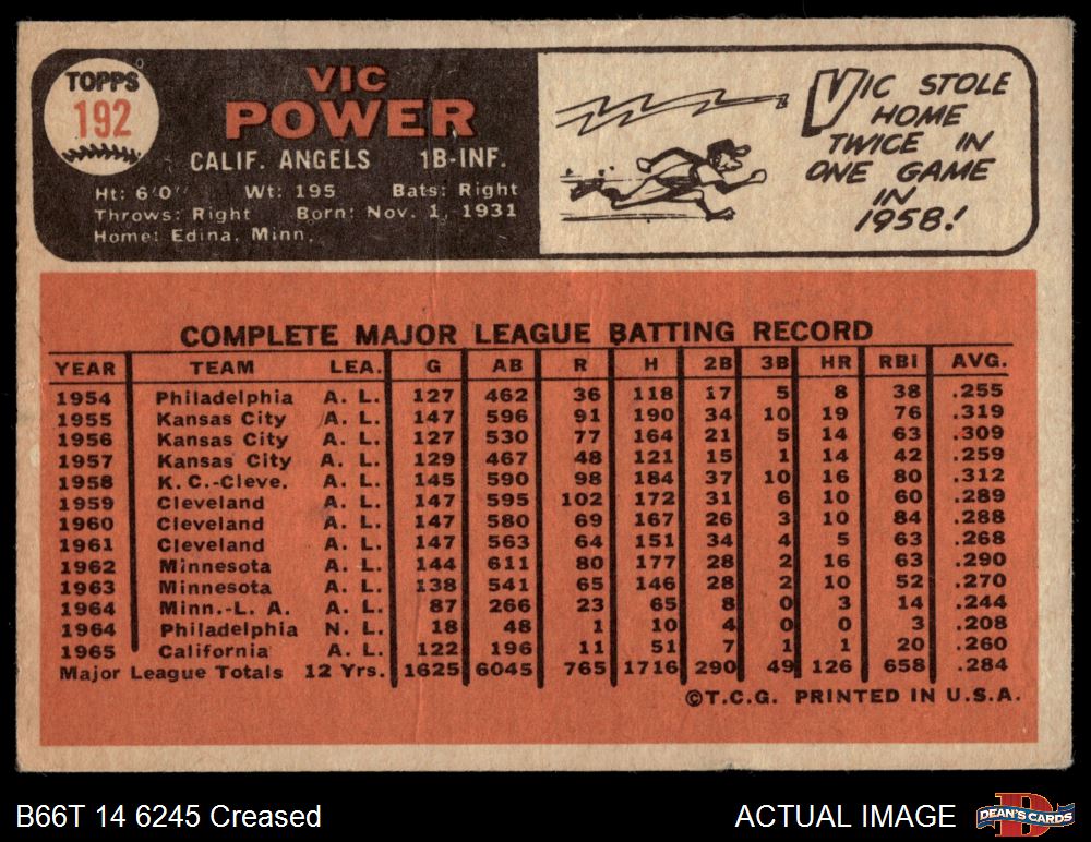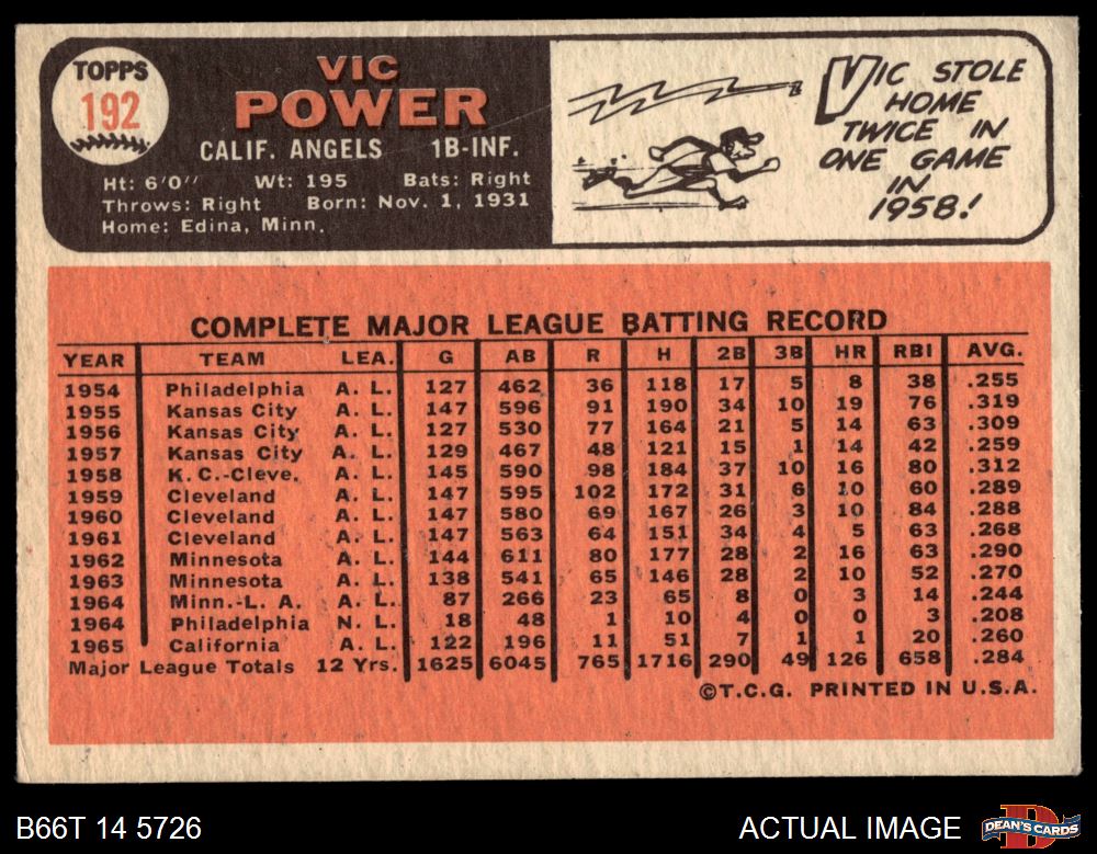 1966 Topps #192 Birth Date listed as 1931 instead of 1927 Vic Power 3 - VG