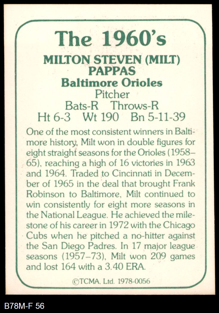 1978 TCMA The 1960's #56 Milt Pappas 8 - NM/MT