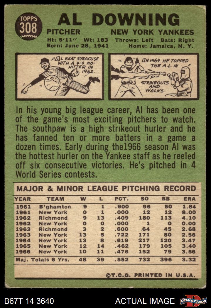 1967 Topps #308 Al Downing 2 - GOOD