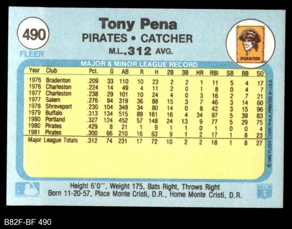 1982 Fleer #490 Tony Pena 8 - NM/MT