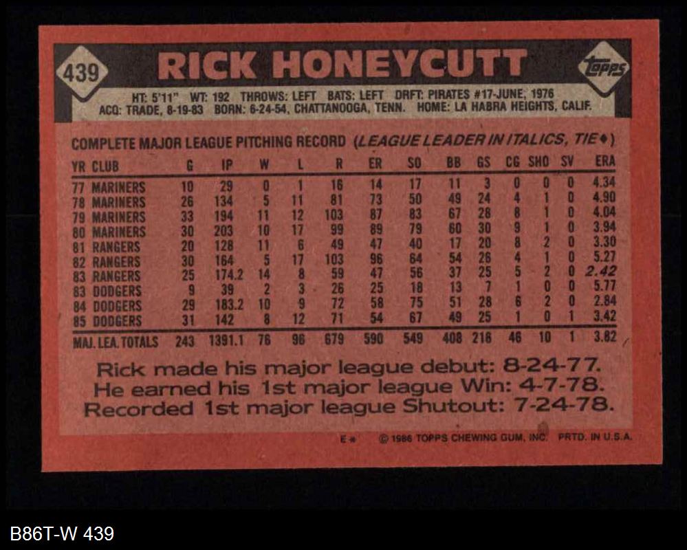 1986 Topps #439 Rick Honeycutt 8 - NM/MT