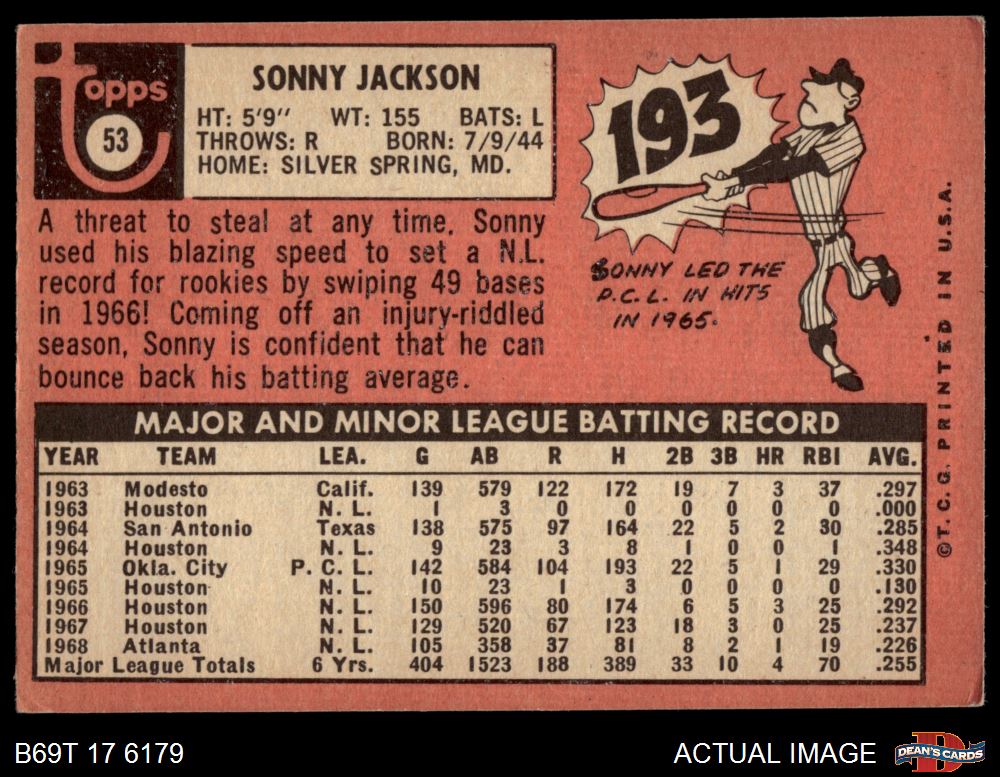 1969 Topps #53 Sonny Jackson 3 - VG