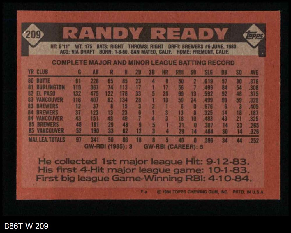 1986 Topps #209 Randy Ready 8 - NM/MT